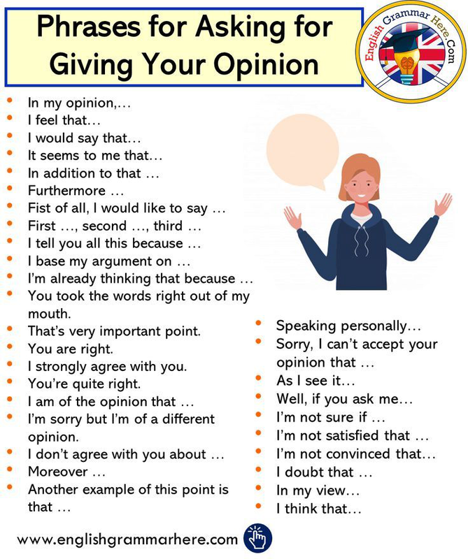How to Express Your Opinions in English! List of common phrases to express your different points of views in English with ESL pictures. Learn these useful expressions to express opinions in English.