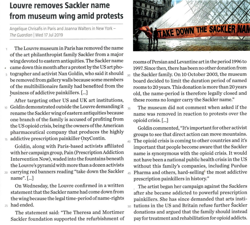 1d- Louvre removes Sackler name from museum wing amid protest, Angelique Chrisafis (Paris) and Joanna Walters (New York), The Guardian, Wed 17 Jul 2019