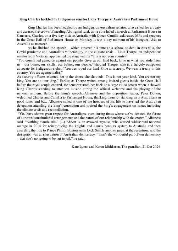 King Charles Heckled By Indigenous Senator Lidia Thorpe At Australia’S Parliament House Kate Lyons And Karen Middleton, The Guardian, 21 Oct 2024