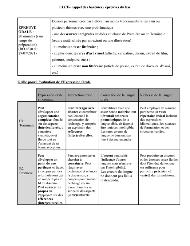 Llce Rappel Des Barèmes Épreuves Du Bac